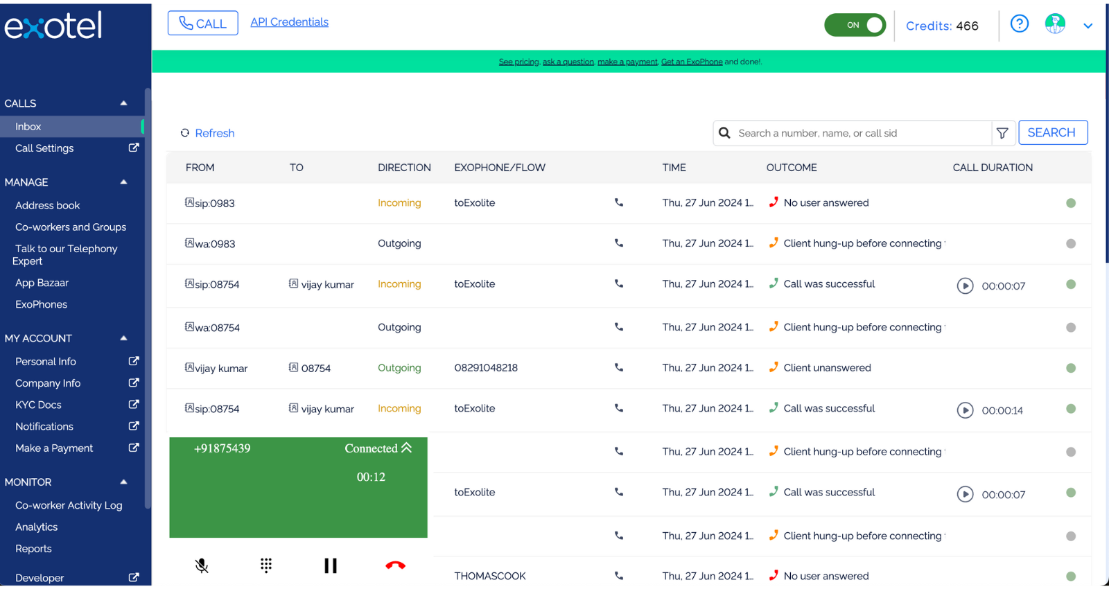 Agents on the Exotel dashboard can accept calls that are made from WhatsApp